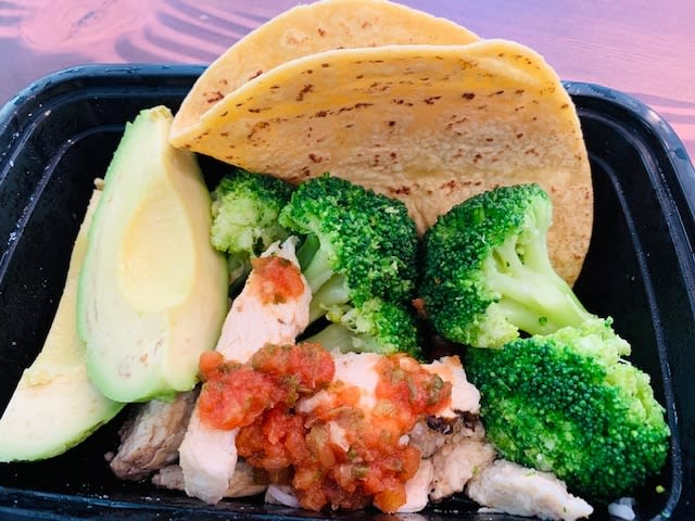 Wheat-corn tortilla, avocado, steamed broccoli, and chicken with salsa.